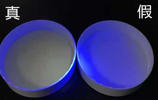 正品的香蒲丽绿公主眼膜的瓶盖照射之后也没有荧光反应,而假货的香蒲丽绿公主眼膜照射之后也出现了荧光反应。