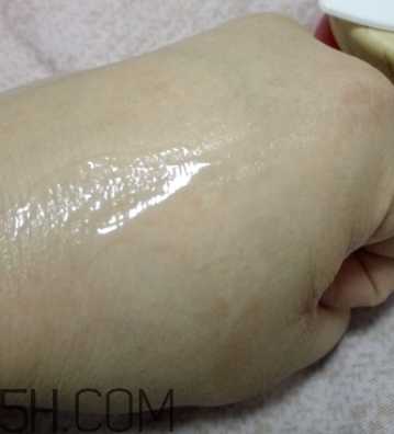 挤出绿豆大小在手上,纯纯的,透透的,很漂亮。凝在一起,很久也没有滑落,擦上去,突然有种很细腻的清凉感觉,很舒服,没有油腻的感觉,好清爽哦, 用完了,手指也不觉得粘腻。