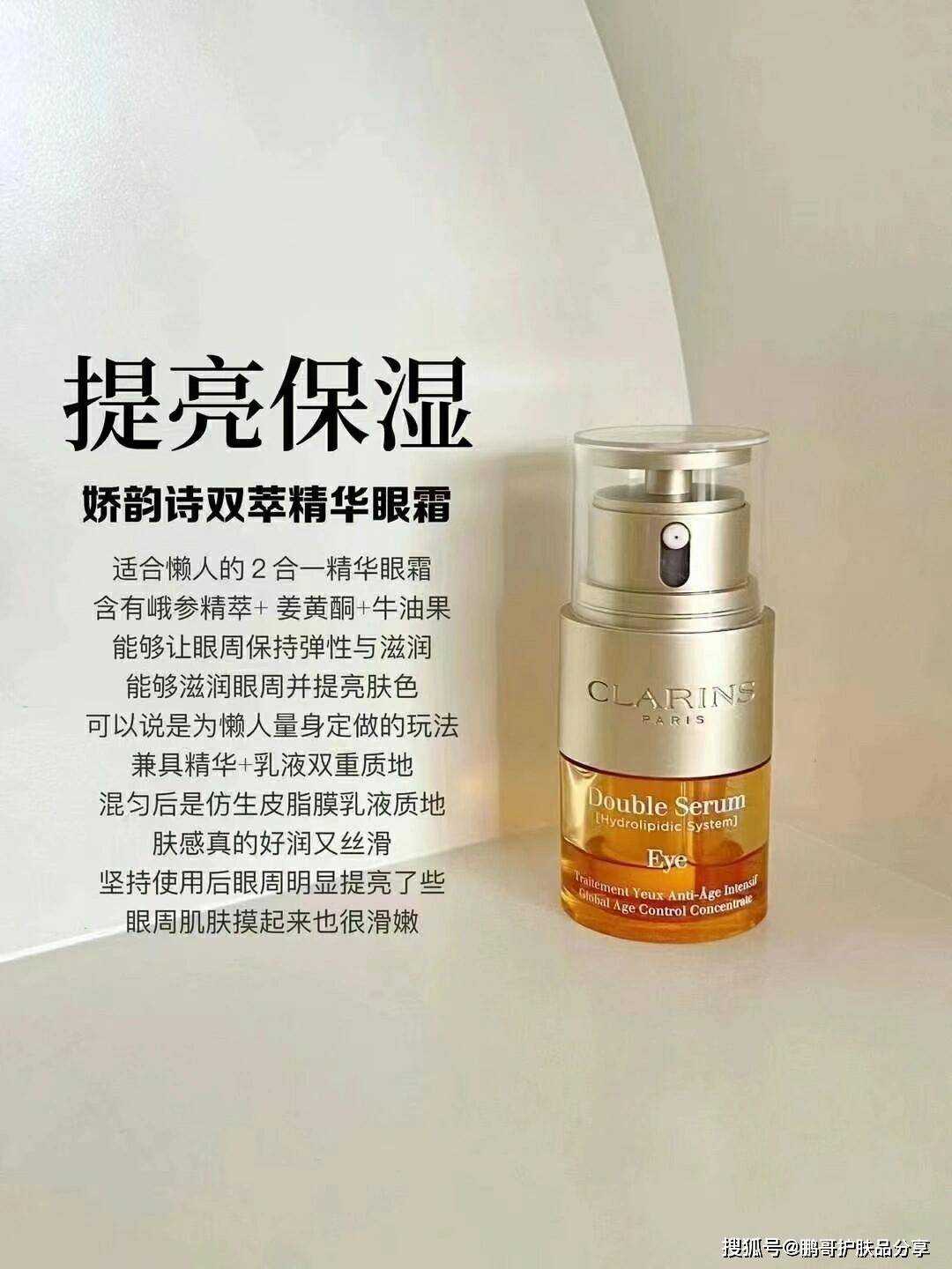 适合懒人的2合一精华眼霜,含有峨参精萃+姜黄酮+牛油果,能够让眼周保持弹性与滋润,能够滋润眼周并提亮肤色,可以说是为懒人量身定做的玩法。