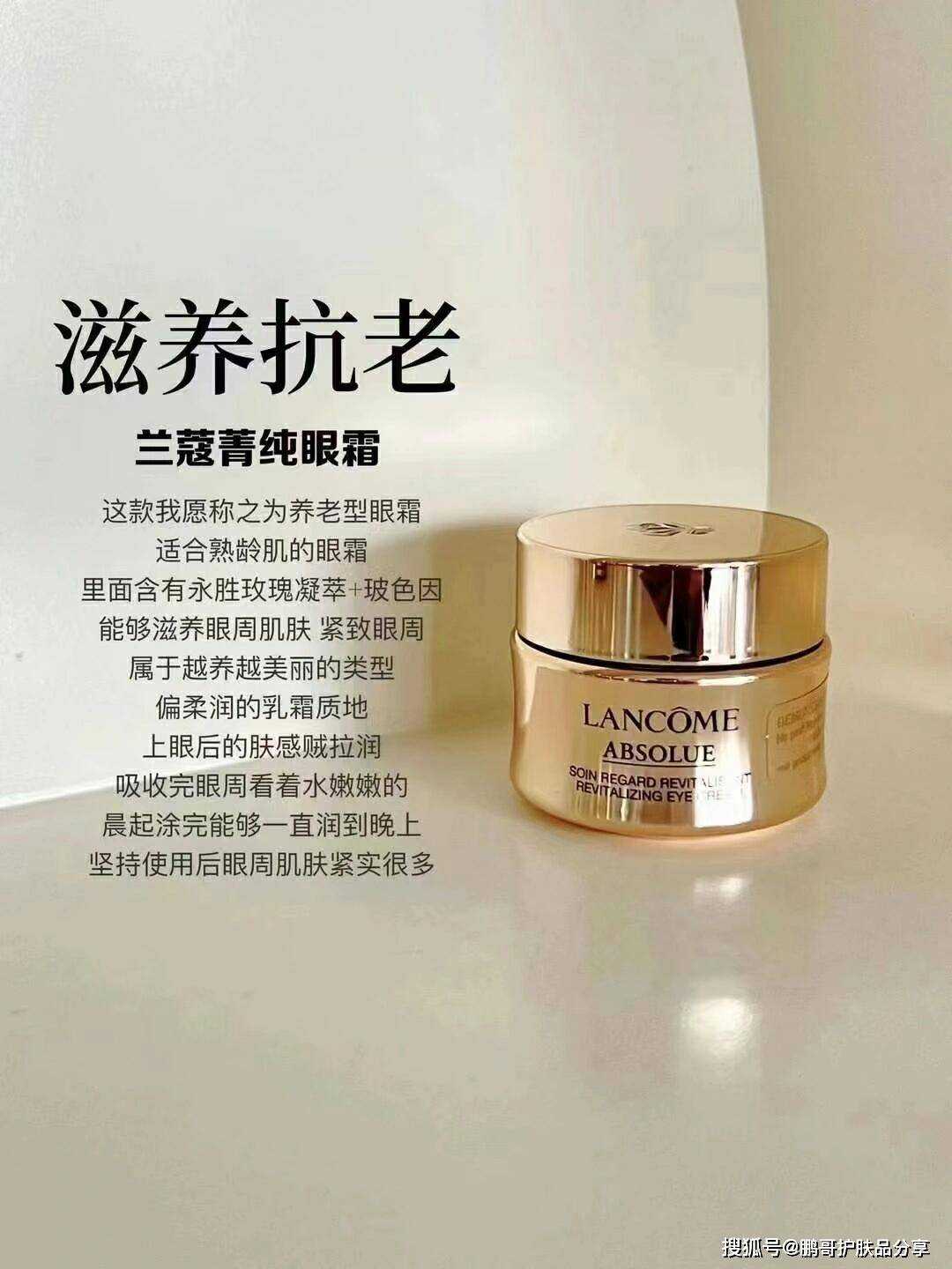 贵妇们都爱用的抗老眼霜,有白尾鸢尾花精萃+高浓度A醇,能够强韧眼周的同时改善暗沉,主打的是贵妇级护肤享受,它是偏轻薄乳霜质地。